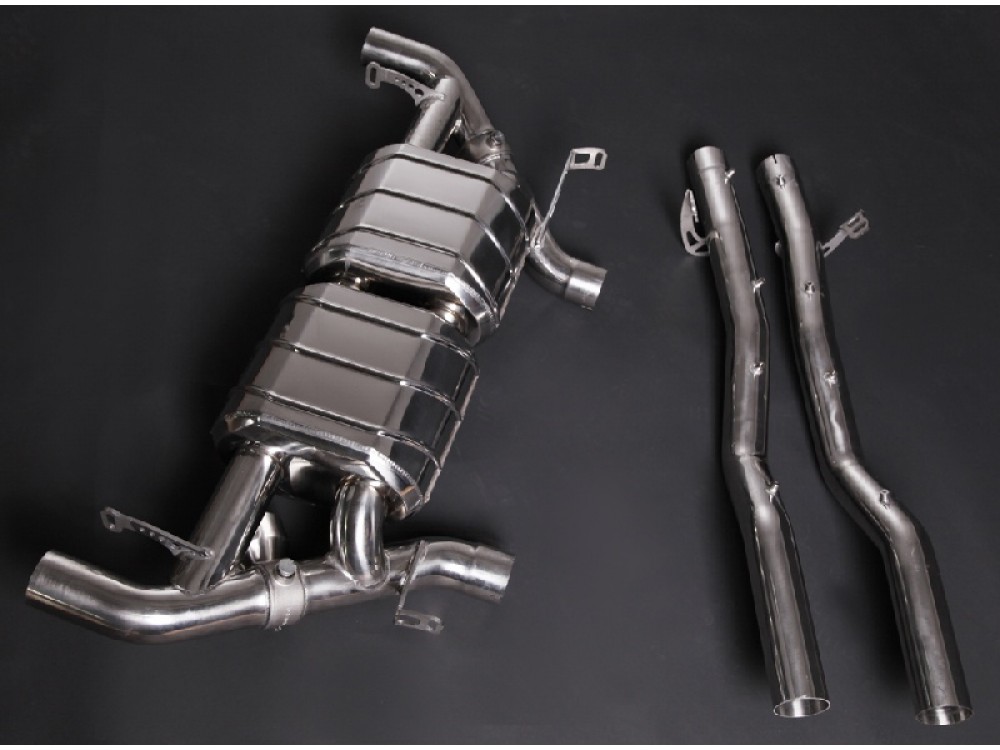 The system is equipped with vacuum-operated valves that allow for sound adjustment. The exhaust can optionally be expanded with 100 CPSI sport catalytic converters or de-cat pipes (resonated or straight-through).